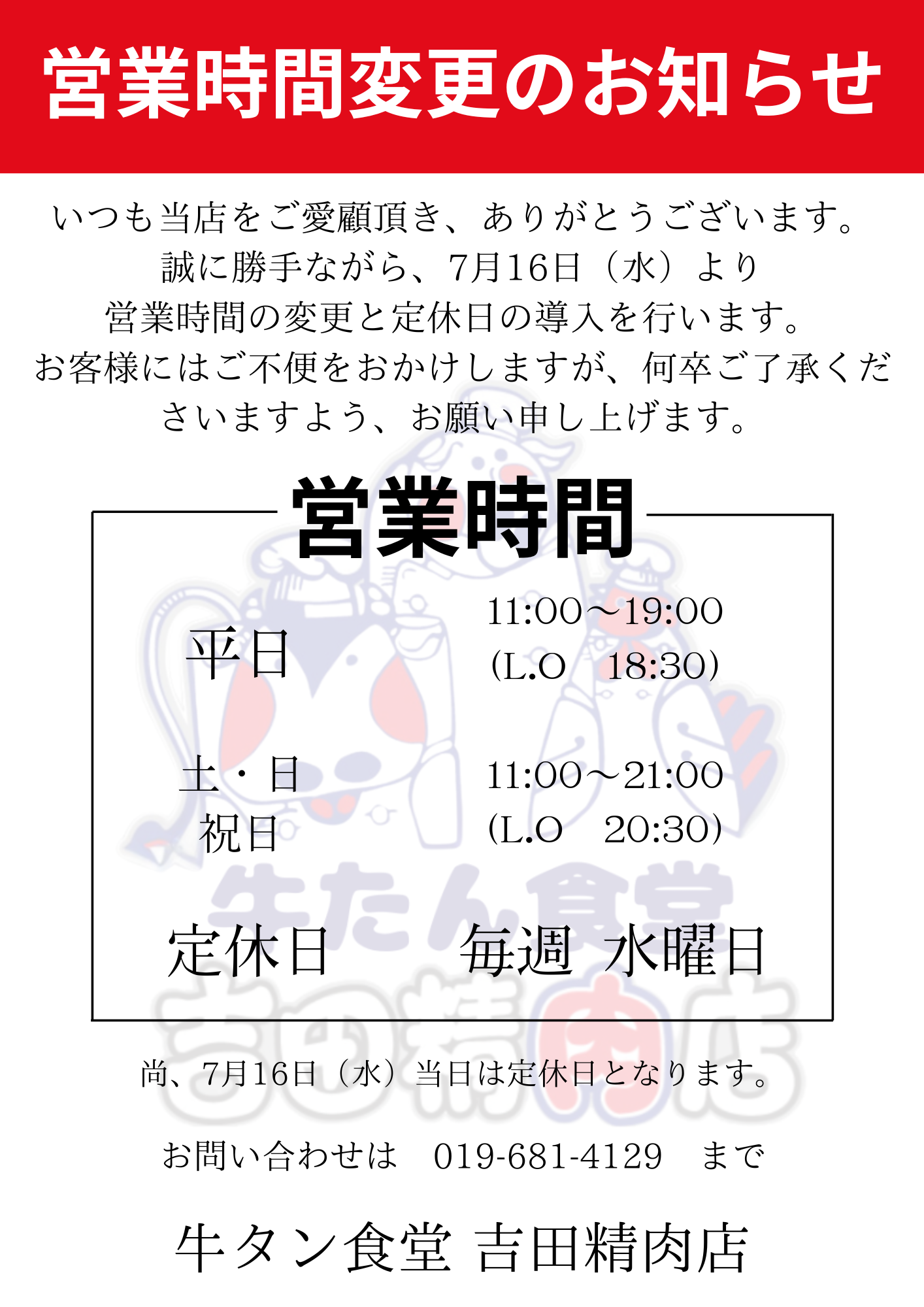 いつも牛タン食堂 吉田精肉店 をご愛顧頂き、ありがとうございます。誠に勝手ながら、7月16日(水)より、営業時間の変更と定休日の導入を行います。ご利用頂くお客様には、ご不便をおかけしますが、何卒ご了承くださいますよう、お願い申し上げます。